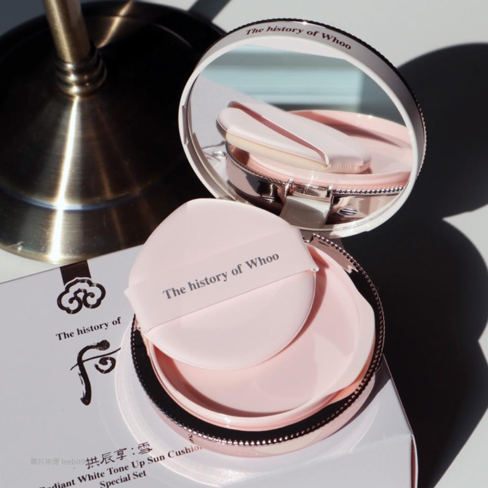 ● The Radiant White Tone Up Sun Cushion has multiple functions of brightening, UV protection, anti-wrinkle and blue light protection, it also helps with smoothing out skin texture before makeup.