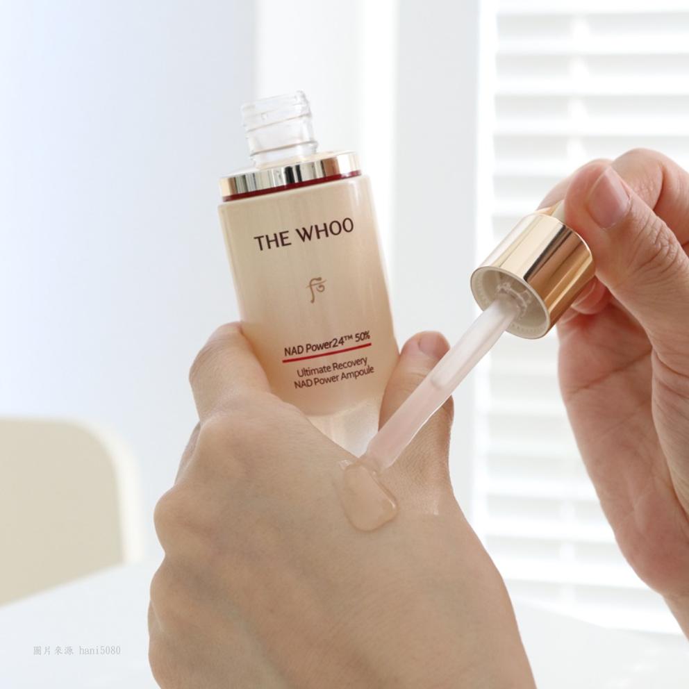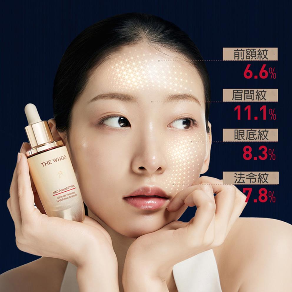 ● NAD Power 24™: NAD+ 是一種存在於所有生物體內的抗衰老成份,以每年4%的速度逐年遞減,乾燥、鬆弛、高壓與作息不良都是NAD+喪失的因素。WHOO 歷經十年研究開發出創新的抗衰老成份-- NAD Power 24™,以獨特的脂質體技術,將純度 99%的 NAD +包裹在脂質體中,使其滲透加快、深度加深、作用加大,是WHOO增強皮膚對 NAD+ 吸收的鉅作。